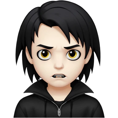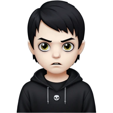 Vampire boy with the black emo hair, pale-white skin, black eyes, little fangs and dark circles under his eyes. He has serious face and he wear a black oversize sweatshot emoji