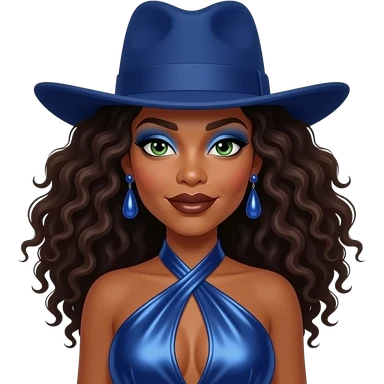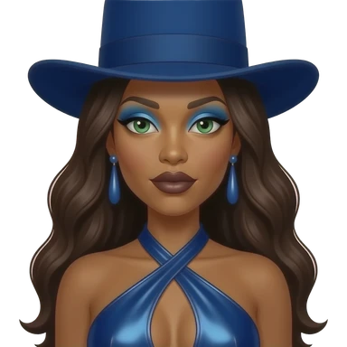 Erykah Badu with green eyes, long dark brown hair, blue tall hat, blue eyeshadow, dark brown lipstick, deep blue metallic halter dress, blue earrings emoji