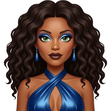 Erykah Badu with green eyes, long dark brown afro hair, blue eyeshadow, dark brown lipstick, deep blue metallic halter dress, blue earrings emoji