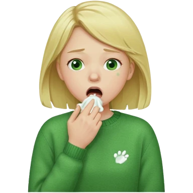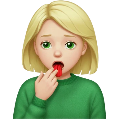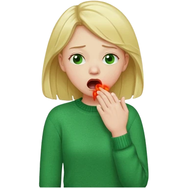 blonde girl has sore throat in green sweater with hand on throat emoji