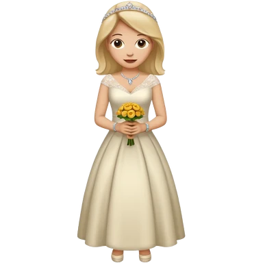 Joven de unos 30 años, de aspecto dulce y elegante. Piel clara, ojos (pueden ser azules o verdes) Rubio o castaño claro, largo, con trenzas o velo. Vestido largo de tonos suaves (blanco, azul o lavanda), con bordados dorados; un manto o toca fina cubriendo la cabeza. Haz todo el cuerpo. emoji