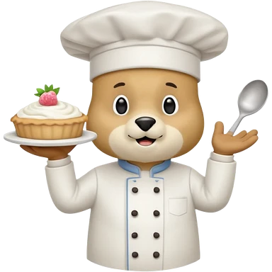 quiero un oso de pie con un delantal de pasteleria y un jorrito de chef que una mano tenga una manga oastlera emoji