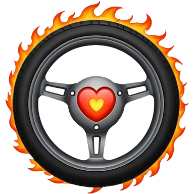 the car wheel is on fire, and in the center of the wheel there is a red fiery heart, high quality emoji