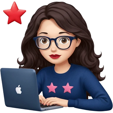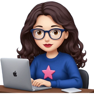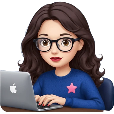 a white young woman with very long wavy dark brown/chocolate hair typing in a computer. she's using glasses, her lips are light red and her cheeks slightly pink. Her eyes are dark brown. She's using a dark blue knit sweater that has a tiny star in the middle emoji