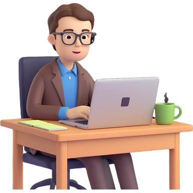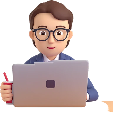 3D emoji style portrait of a calm student taking an online test, wearing glasses, looking at a computer screen emoji