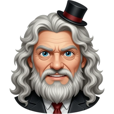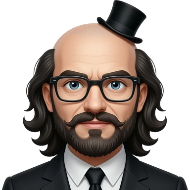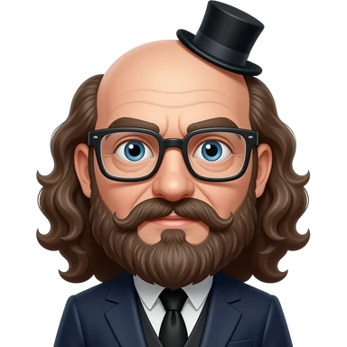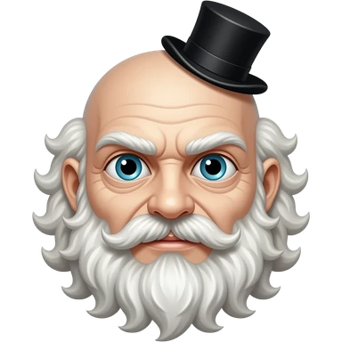 Evil man with small eyes, a bald head but long curly sideburns that has a long beard and is wearing square glasses as well as a tiny top hat emoji