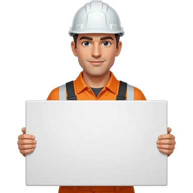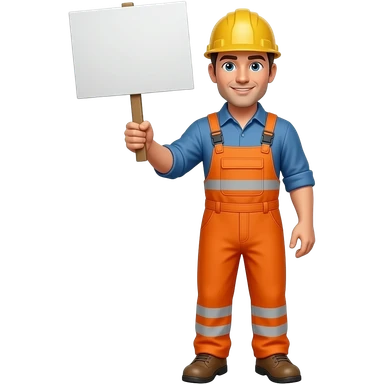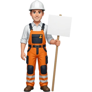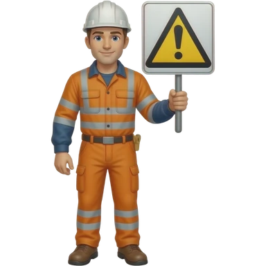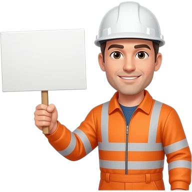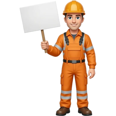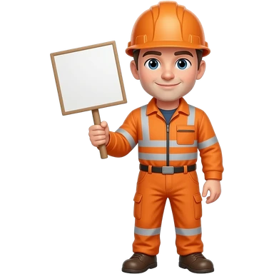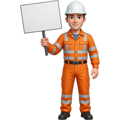 man standing in a hard hat and full orange hi-vis overalls with sleeves holding a sign emoji