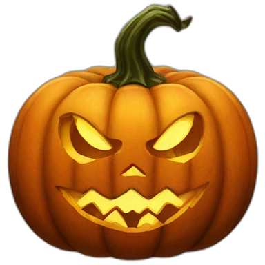 Create an emoji of a carved pumpkin with glowing eyes and a wicked grin. The pumpkin should be glowing from the inside, with shadows creeping out. Make the pumpkin look ominous and menacing, with green tendrils wrapping around it. The face of the pumpkin should appear evil, with exaggerated jagged teeth, and there should be dark smoke rising from its top. emoji