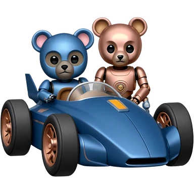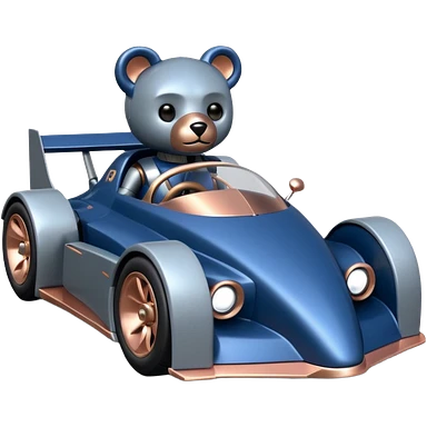 Carbonized Metallic dark blue and rosegold-accented racing car for furry-faced grey bearded evil alien scary robot teddy bear and passenger with custom aero body and rear spoiler (Star Wars style) emoji