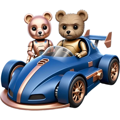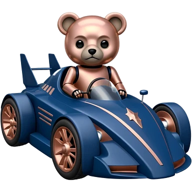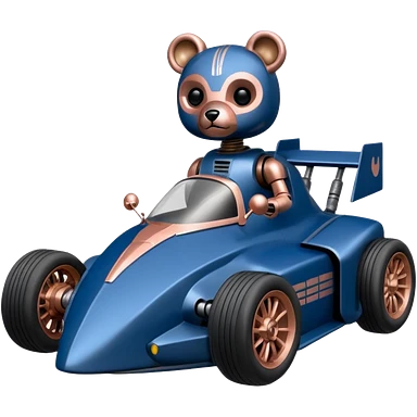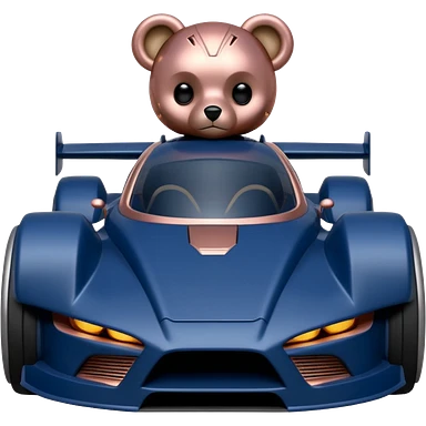 Real-proportional dark blue and rosegold-accented racing car for furry-faced evil alien scary robot teddy bear with rear spoiler (Star Wars style) emoji