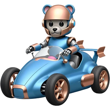 Real-proportional dark blue and rosegold-accented retro racing car driven by furry-faced small evil alien scary robot teddy bear with rear spoiler (Star Wars style) emoji