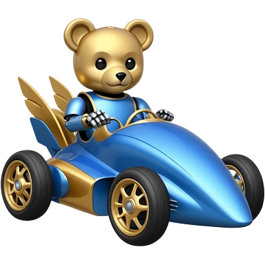 Metallic blue and gold-accented kid-sized racing car for furry-faced grey bearded evil scary robot teddy bear with custom aero body and rear wing and motorcycle-sized wheels emoji