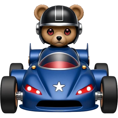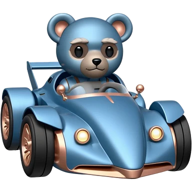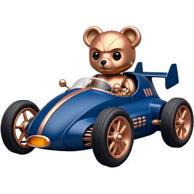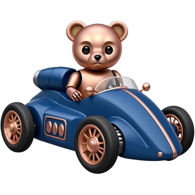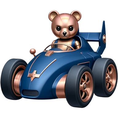 Real-proportional dark blue and rosegold-accented retro racing car driven by furry-faced evil alien scary robot teddy bear with rear spoiler (Star Wars style) emoji