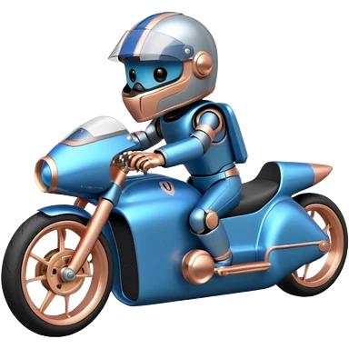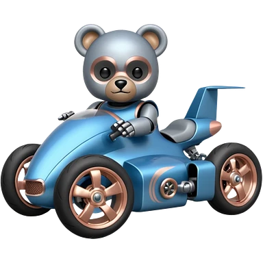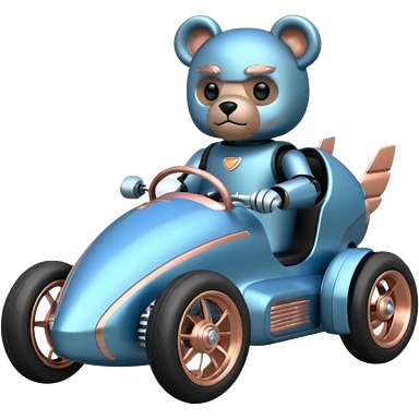 Metallic blue and rosegold-accented kid-sized racing car for furry-faced grey bearded evil scary robot teddy bear with custom aero body and rear wing and motorcycle-sized wheels emoji