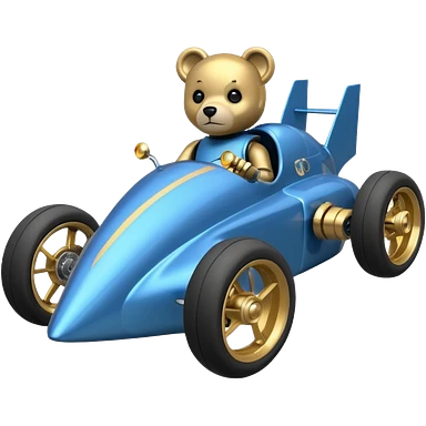 Metallic blue and gold-accented kid-sized racing car for furry-faced evil scary robot teddy bear with custom aero body and rear wing and motorcycle-sized wheels emoji