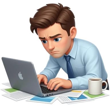 Create an emoji of an exhausted entrepreneur chained to their laptop, with stacks of invoices around them. They have tired eyes, messy hair, and a cold coffee next to them, symbolizing endless work without real progress. emoji
