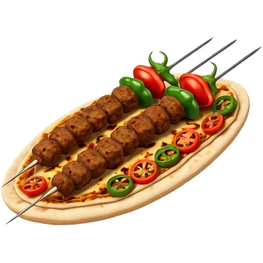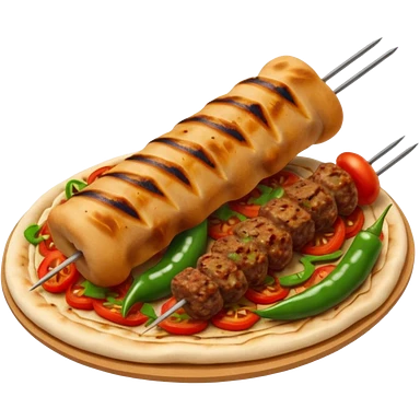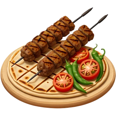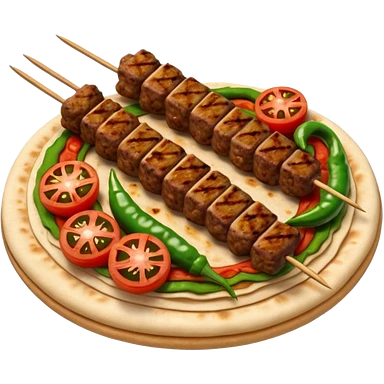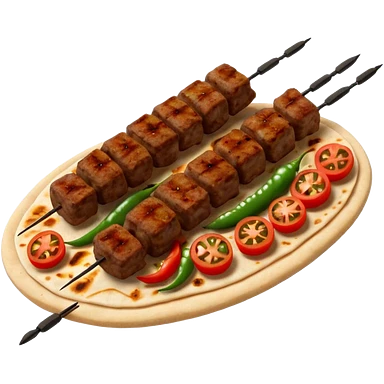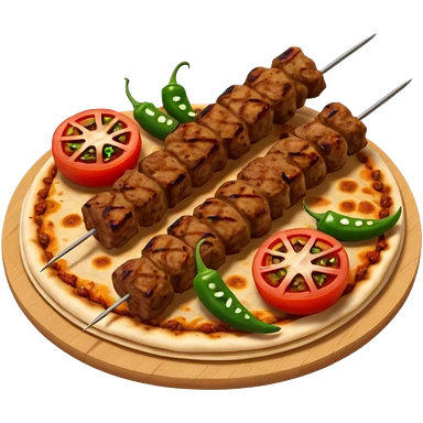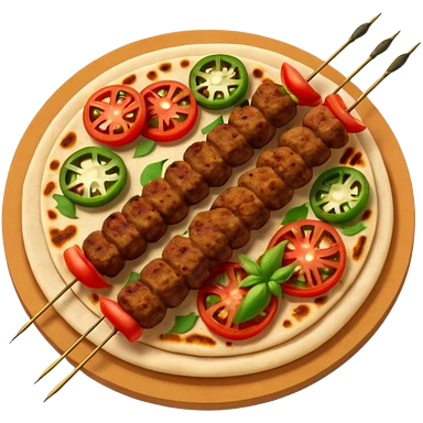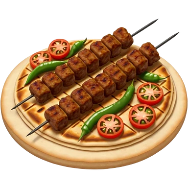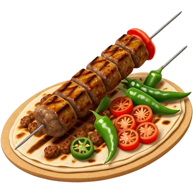 Adana kebab object icon, spicy grilled minced meat skewer, served on flatbread, grilled tomatoes and green peppers on the side, smoky char marks, juicy texture, 3D cartoon, mobile game icon style, centered, clean background, no text, no watermark emoji