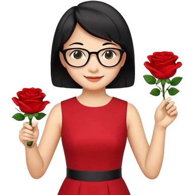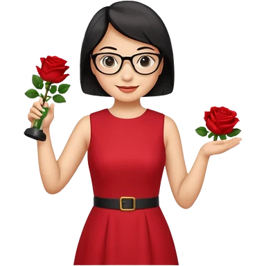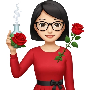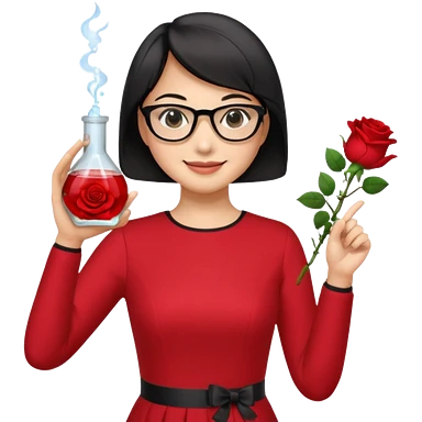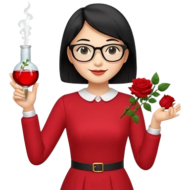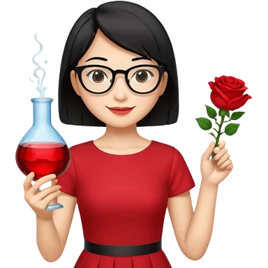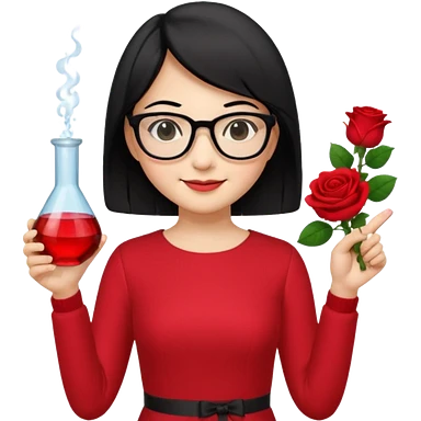 female asian chemistry teacher wearing glasses holdin a flask pointing right with straight short hair to her shoulders wearing a red dress with roses on it and black hair and make the glasses more retangle and make her hold a flash with one hand and with the other point right and make her smile emoji