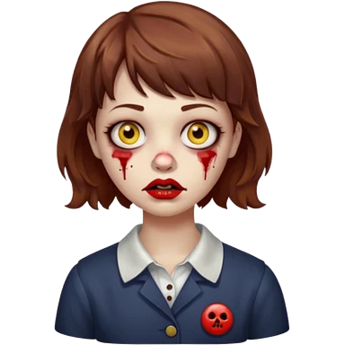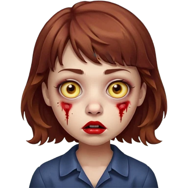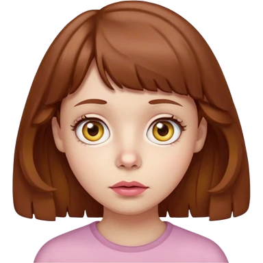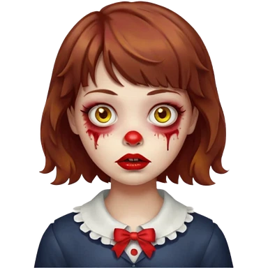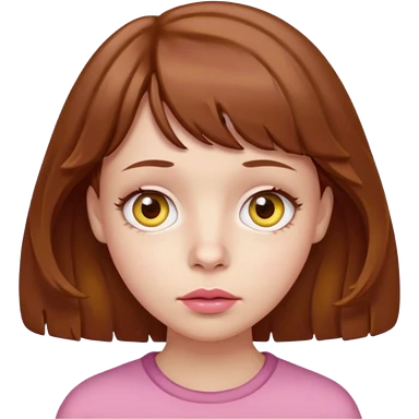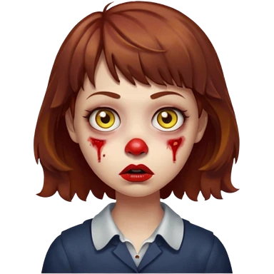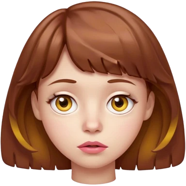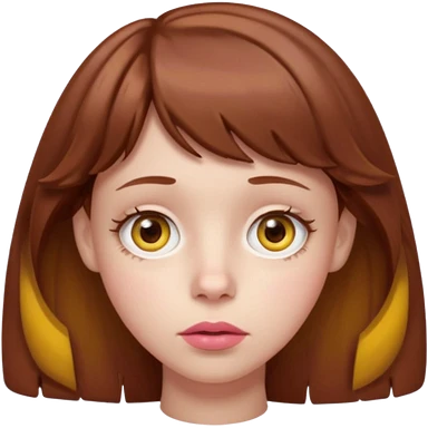 FAÇA UMA PERSONAGEM FOFA COM NARIZ DE BOLINHA AVERMELHADO CLARO E ZUMBI CABELO MARRON ONDULADO E FRANJA CURTA COMO SE NÃO SOUBESSE OQ FEZ LÁBIOS CLAROS FECHADOS E OLHOS AMARELOS emoji