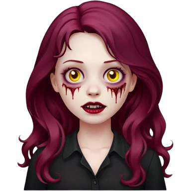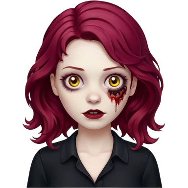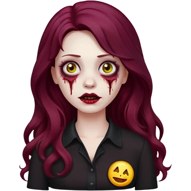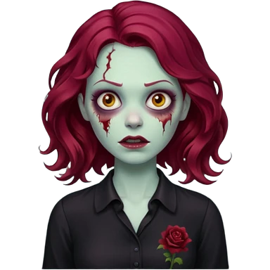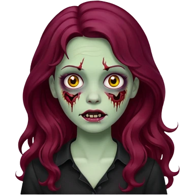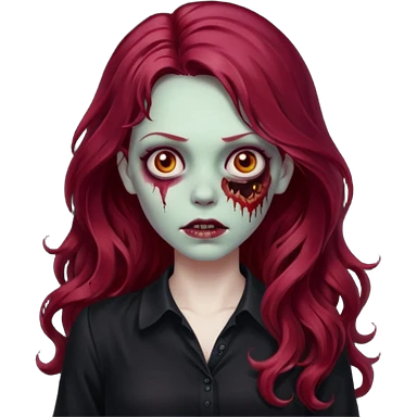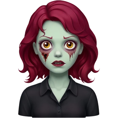 Faça me um emoji de um zumbi mulher de cabelos vermelho borgonha longos ondulado usando uma blusa preta