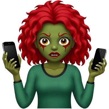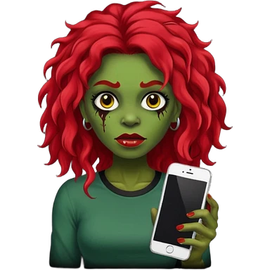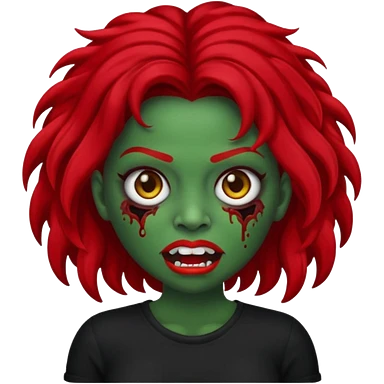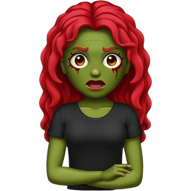 Faça me um emoji de um zumbi mulher de cabelos vermelho escuro longos ondulado usando uma blusa preta, faça no estilo iphone, o tom de pele dela tem que ser verde emoji
