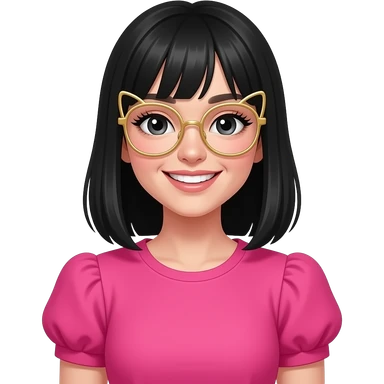 Gere um emoj de uma linda moça de pele clara,cabelo médio, na altura do ombro,,liso,preto, sorrindo. Ela possui cilios grandes com extensao de cilios, e usa um oculos estilo "gatinho" douradomoça veste uma camiseta com mangas curtas, mangas bufantes, rosa choque emoji