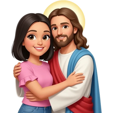 Gere um emoj de uma linda moça de pele clara,cabelo médio na altura do ombro,,liso,preto, sorrindo. Ela possui cilios grandes com extensao de cilios, a moça veste uma camiseta com mangas curtas bufantes, na cor rosa choque. A moça esta acaompanhada de Jesus, os dois estao abraçados de lado. emoji