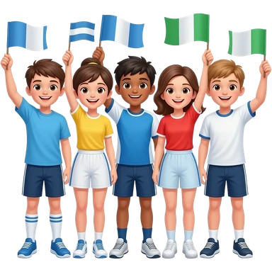Vários atletas jovens juntos ventindo azul, branco e verde emoji