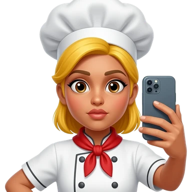 a blonde female chef with a pretty face, smiling, who looks tender but whose uniform contains white and pastel blue tones emoji
