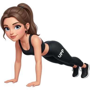 fair-skinned-woman,-light-gray-blue-eyes,-ash-brown-brows,-ash-light-brown-hair-tied-back,-slim-athletic-body,-black-workout-set,-black-sneakers-with-white-soles in plank position with "UPP" written on thigh emoji