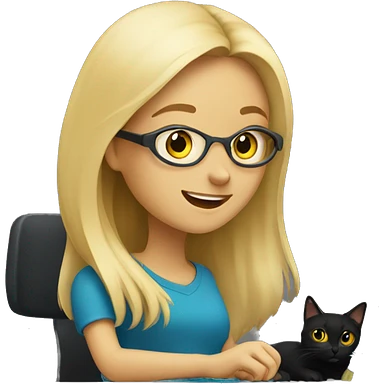 A long haired blonde girl designing with a computer, with a black cat emoji