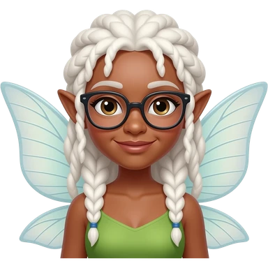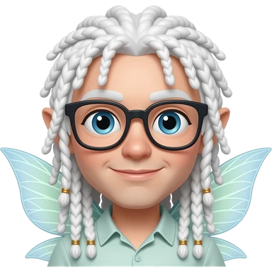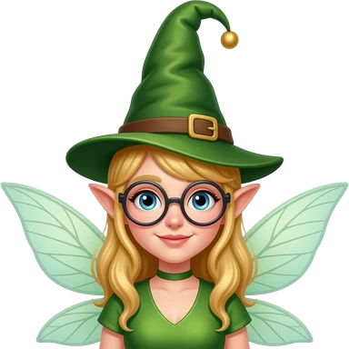 fairy face with green very curly long hair and fairy wings sticking out, glassess, not realistic emoji