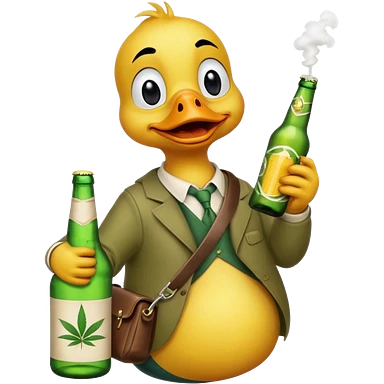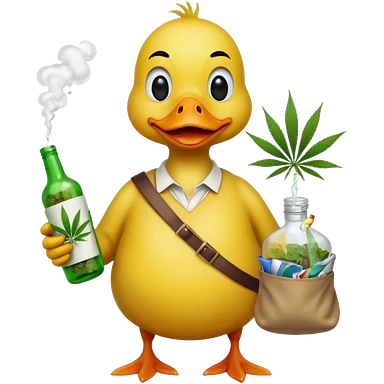 Drunk and high duck animal holding wĺeed bottle and a bag of weed. Looking really drunk emoji