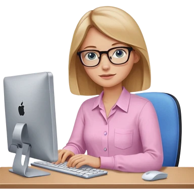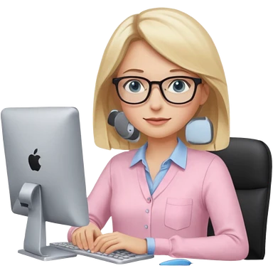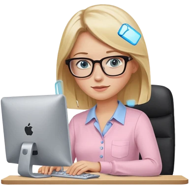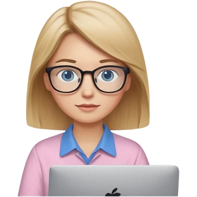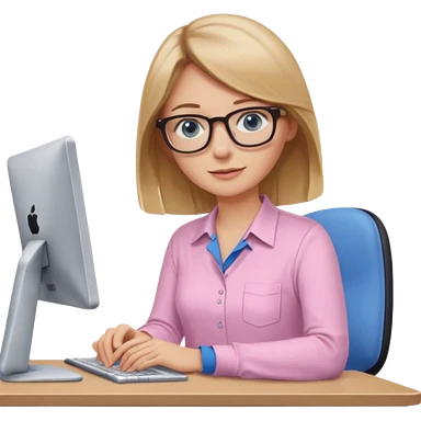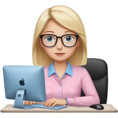 redattrice editoriale. Bionda, capelli lisci biondo scuro, lunghezza media. Occhi blu con occhiali. è al pc a lavorare. Indossa una camicia rosa chiaro emoji