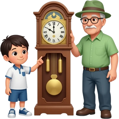 My Grandfather's clock Old Man Green shirt and hat Asian boy is looking for the old clock emoji