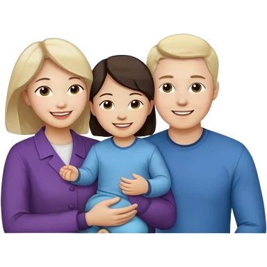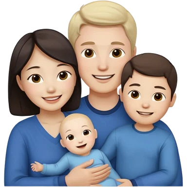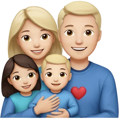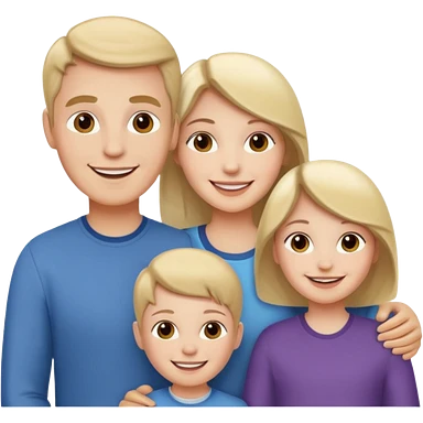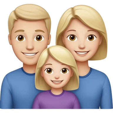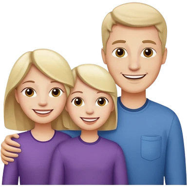 Family portrait with father with dark brown hair and blue eyes, mother with light brown hair and blue eyes, three blonde little girls with blue eyes emoji