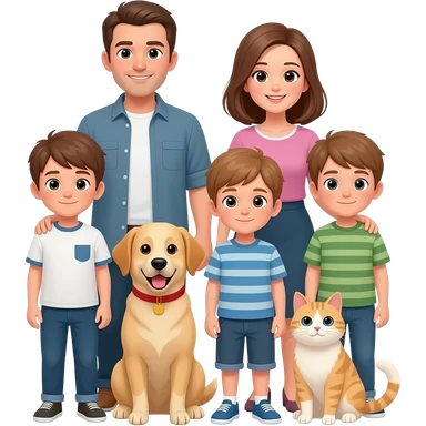 family, dad has brown hair. mom has brown shoulder length hair, two kids (boys) both with light brown hair. a tan dog, a cream dog, and a cream cat. emoji
