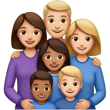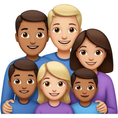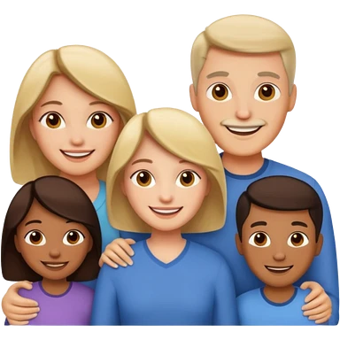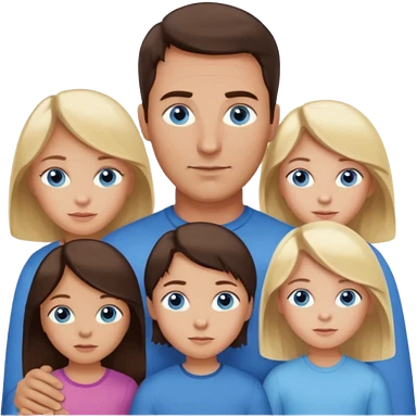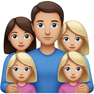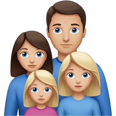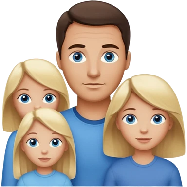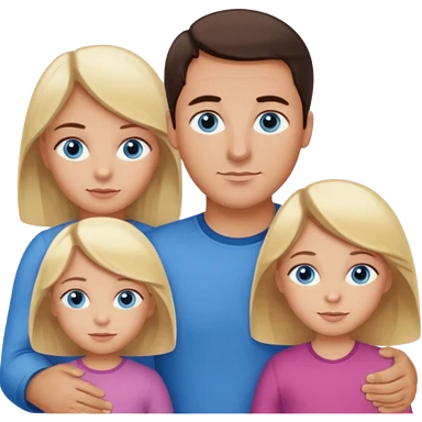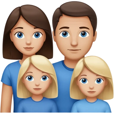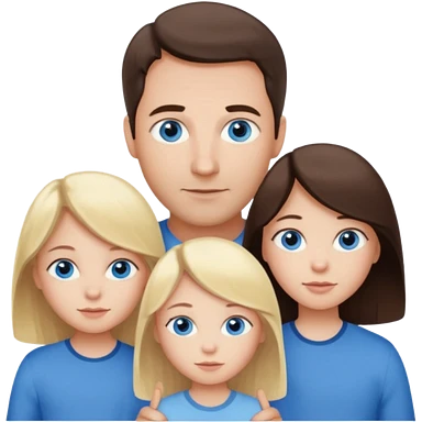 Family portrait with father with dark brown hair and blue eyes, mother with light brown hair and blue eyes, three blonde little girls with blue eyes emoji