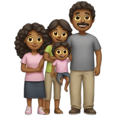 A family consisting of 1 mom with black black wavy hair , 1 girl with black buzz cut hair and 1 girl medium skin tone and black long hair , 1 white man with black hair and short mustache emoji