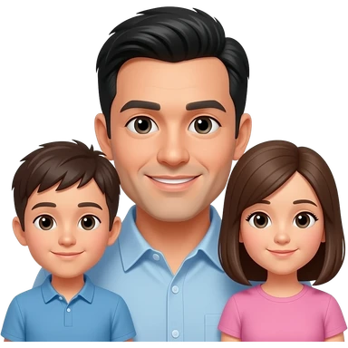 family, dad has brown hair. mom has brown shoulder length hair, two kids (boys) both with light brown hair. a tan dog, a cream dog, and a cream cat. emoji