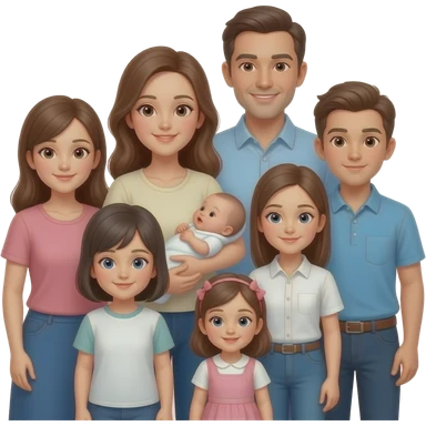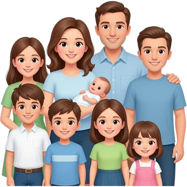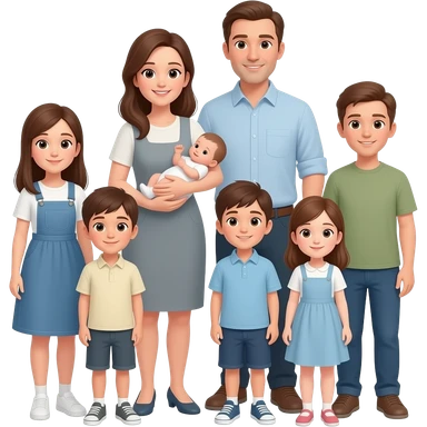 family of 8 white people and all with brown hair with 2 parents mom and dad with 6 kids 12 year old girl 10 year old boy 10 year old boy 8 year old girl small 2 year old girl and newborn girl emoji
