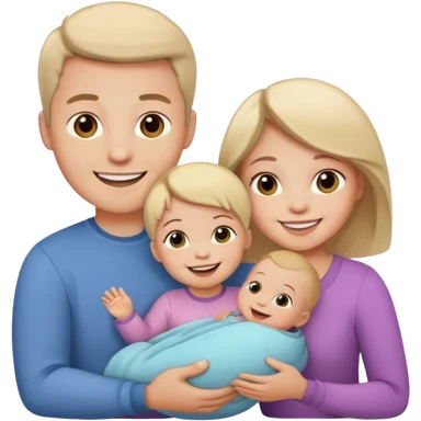 Create a family emoji. The mother is brunette, holding a newborn baby in her arms and the father is blonde, hugged her from behind, both smiling emoji