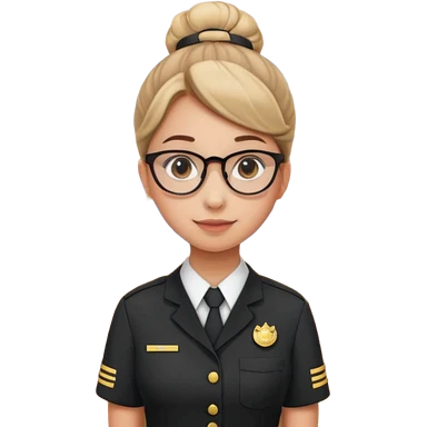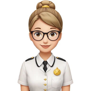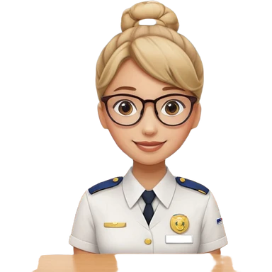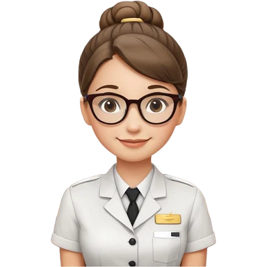 Young girl, bun hair, wearing uniform of reception with hotel name badge, glasses, stand behind the desk emoji