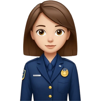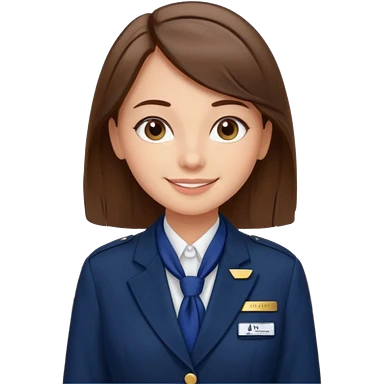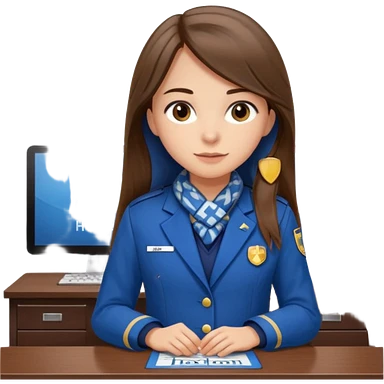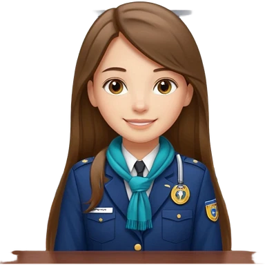 Young girl, long brown straight hair, wearing uniform jacket with hotel name badge, tasteful scarf, stand behind the desk emoji
