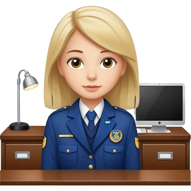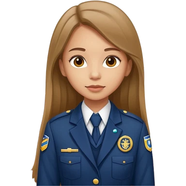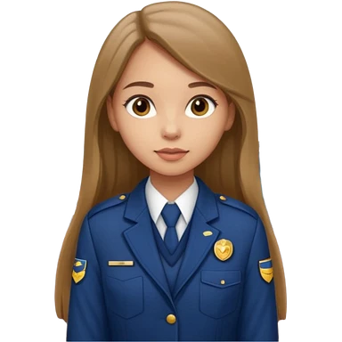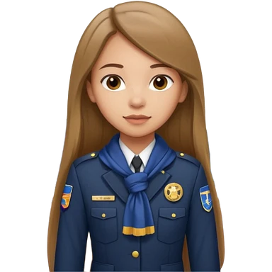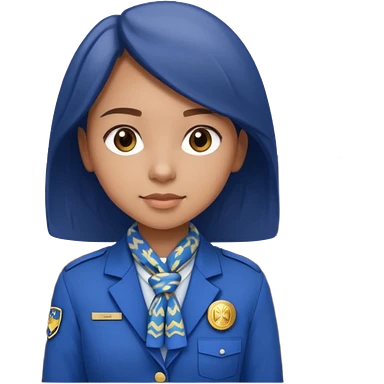 Young girl, long straight hair, wearing uniform jacket with hotel name badge, tasteful scarf, stand behind the desk emoji
