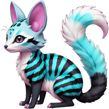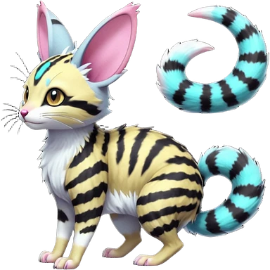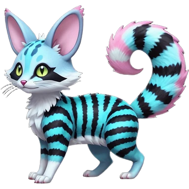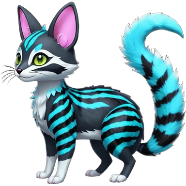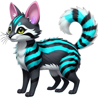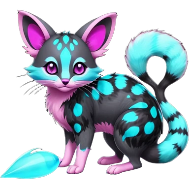 Fantasy onyx-obsidian-pitch-Black-coated with glowing random cyan and magenta markings divine beautiful elegant pretty precious cute young youthful Fakémon-Pokémon-alien-opossum-feline-serval-caracal-chinchilla-Minccino-hybrid-creature with a big fluffy bushy striped tail (full body) emoji