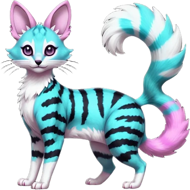 Fantasy Abyssal onyx-obsidian-pitch-Black-coated fur with glowing random cyan and magenta markings divine beautiful elegant pretty precious cute young youthful Fakémon-Pokémon-alien-opossum-feline-serval-caracal-chinchilla-Minccino-hybrid-creature with a big fluffy bushy striped tail (full body) emoji