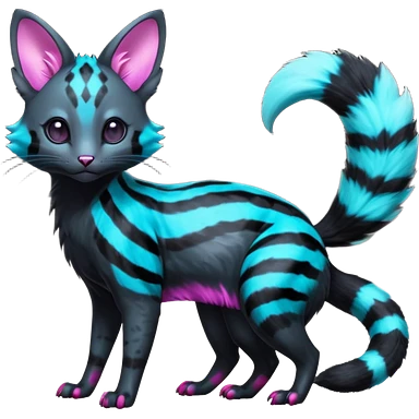 Fantasy Abyssal onyx-obsidian-pitch-Black-coated fur with glowing random cyan and magenta markings divine beautiful elegant pretty precious cute young youthful Fakémon-Pokémon-alien-opossum-feline-serval-caracal-chinchilla-Minccino-hybrid-creature with a big fluffy bushy striped tail (full body)emoji