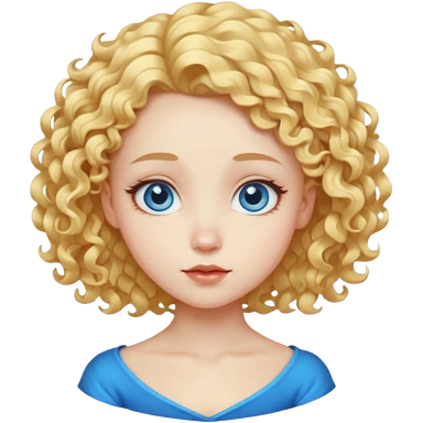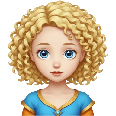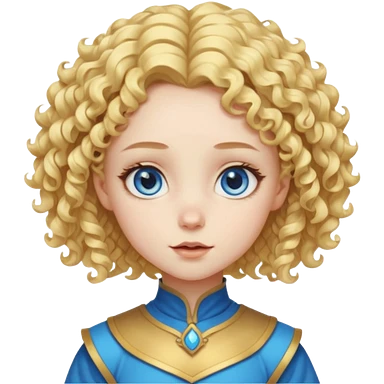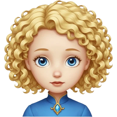 Cute fantasy character head with a large forehead, big bright blue eyes, and short, voluminous golden blond curly hair. Stylized, colorful, cartoon look focused on cuteness. emoji