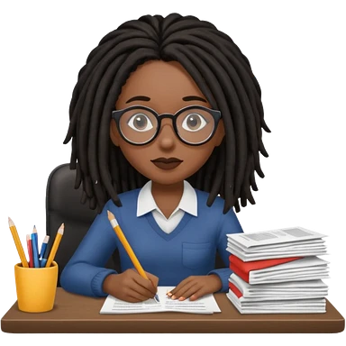 Black female with dark dreadlock hair and large round glasses with a desk full of papers emoji